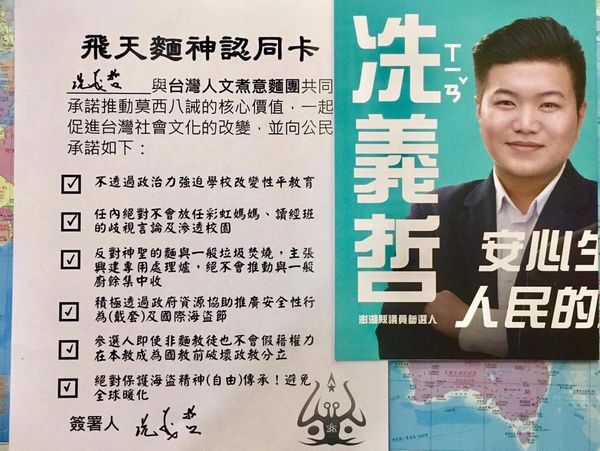 為了讓國際海盜節(海洋文化)、海盜精神(自由民主)、人文主義、莫西八戒、政教分離、性別平等教育等麵教核心價值,能夠在台灣生根茁壯,我們迫切需要政治人物的支持與認同,2018九合一選舉共有9位候選人簽暑。